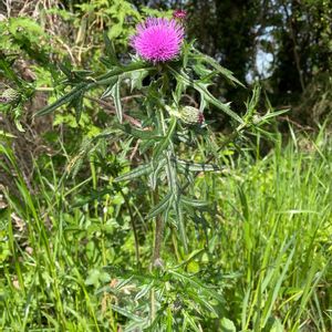 ノアザミ(キク科)神奈川県より 2033.04.16撮影📲在来種 春に咲くのはノアザミだけ! 秋にはとっても似ているノハラアザミが咲きます♪♪ 違い:ノハラアザミの総包片(ギザギザした萼のような所)はベタベタしますが、手には付きません🖐🏻