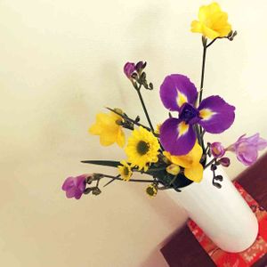 アヤメの色が綺麗だったので、買ってみました。敷物は昔ちょっとやっていた茶道の古帛紗です。柄がお気に入り。