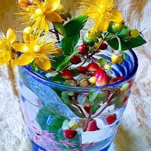 ヒペリカムのお花を生けました 先週の雨や風で 満開のお花でしたが さんざんな姿に! 重くなった枝を剪定して スッキリ花姿にしました 切り落とした枝を花瓶に生けたり 残骸として捨てる中に 見つけた花や実を グラスに生けました グラスの中に 実を沈めたので 涼しげになりました オール ヒペリカムです