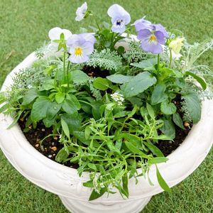 植え付けから1か月経過したビオラ寄せ植えです。 天使の誘惑は咲き始めが黄色ですが、だんだんと紫へ花色が変わっていくため綺麗です。(写真2枚目から4枚目へ) 水色のビオラも花数が増えました。シルバーレースとアリッサムもボリュームが出てきました‼︎