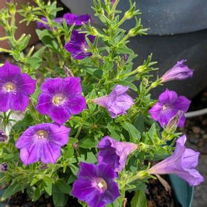 こんにちは😊 昨夜の雨で庭中が潤いました 今日は晴れています☀️ ①ペチュニア💜 3年目を迎え根元は木質化して いますが少し丈が伸びて12cm 程になりました ②南天の実 これは赤い実になります🟢🔴 ③④⑤ イヌホオズキの花と実です 雑草の中に生えています 🤍🟢⚫