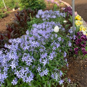 フロックス、開いてきました✨ 午前中は日陰のこの花壇で、原種チューリップの次に花が開きました😊 開きかけはかなり青っぽいですが、完全に開いたらまた違った雰囲気になりそうです。