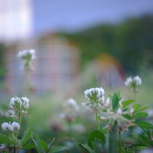 自信はないですが、シロツメクサかな。 職場近く、お散歩コースの公園で。 後ろで変にボケているのは、滑り台とジャングルジムです。