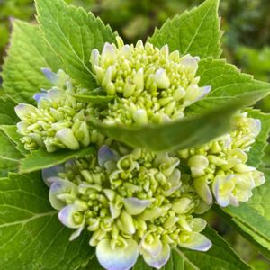 紫陽花の花が、今年伸びた芽から咲いてます❣️💚 しかも先端に房咲き⁉️ 花畑の咲き終わって、今年の花たちを綺麗に刈り取った 大きな株の、つんと伸びた枝に、段菊の様に❣️ やっぱり、今年は、何か変です‼️ でも、一生懸命咲こうとしているから、可愛い😍💙