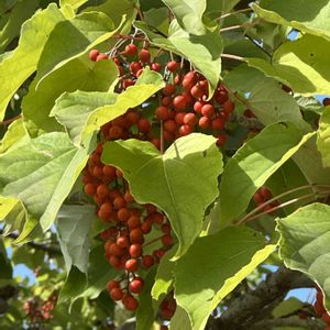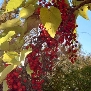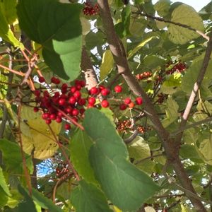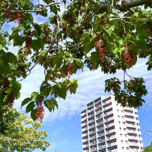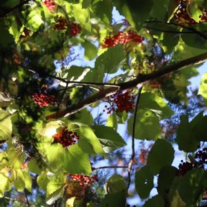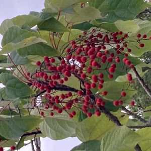 2025.10.18 Saturday ☀️🌤️ すっきりとした青色の空 気持ちの良い秋の日 お出かけ先で見上げたイイギリの木に真っ赤な実がブドウのようになっていました。 今年はすごい豊作のような実り方です。 4枚めは、大好きな木を仰いで写しました。 5枚め 雌雄異株なので、近くに雄株が生えています。 〜メモ〜 イイギリ(飯桐) ヤナギ科イイギリ属の落葉高木 名前の由来: むかしこの葉っぱで飯を包んだことからと、葉っぱが桐の葉っぱににていることから。 因みに、桐の字は、下の幹と上の幹の太さが同じことから木ヘンに同で桐と書くそうです。