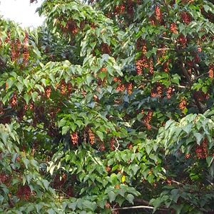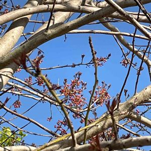 No.1263 イイギリ(飯桐) 別名:南天桐 イイギリ科イイギリ属 その2 イイギリの実は赤く美しいので、生け花にも使われます🎵 南天桐の別名は、実が南天に似ていることから🎵 これを目当てに小鳥🐦️たちが集まります☺️ 飯桐の実を高空に大手門 首藤勝二