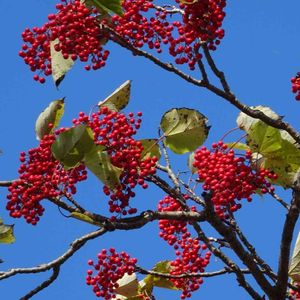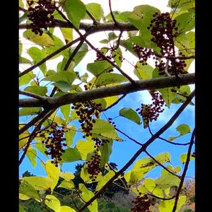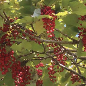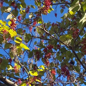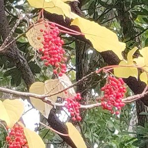 イイギリ(飯桐)の実🍒✴️ 先週、ドライブ途中のお蕎麦屋さんの庭先に、イイギリの大木を見つけました🌳👀🎶。 たわわに葡萄の房のような実をつけていて、見応えありました🍇😲✴️。 青空に、赤い実が映えてとても綺麗~😍🎶。 🍂葉の形が桐に似て、昔は、この葉で、ご飯(おこわ)を包んだことからついた名前だそうです🍚🍂。 🍒実がナンテンに似ている事から、別名ナンテンギリ(南天桐)とも言われてます。 成長が早く、材木は、下駄などに 利用されるそうです🌳。 果実は、生食可らしいのですが、苦くて甘味はないとの事。加工して食べられる事もあるそうです🍒。
