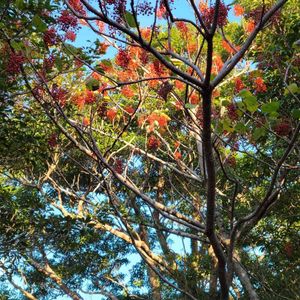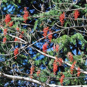高い木に赤い実がブドウのようになっています