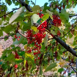 おはようございます😊 今日は快晴で気持ちがいいです🟦☀️ 橋のたもとのイイギリの木🌲に 真っ赤な🔴🔴🔴実をわんさかと つけていていい感じでした💕 この時期だったんだなぁーと改めて暫く、見上げていました^ - ^ 今日の花散歩🚶♀️pic