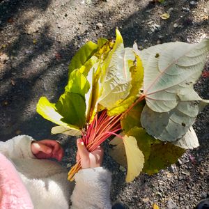 年末、イイギリの葉っぱを束ねてブーケにする娘たち 茎が鮮やかに赤いです🔴 見上げると大木(5枚目)