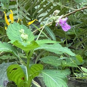 里山を歩いてみれば… キバナアキギリ×3💛 ノブキ(野蕗):花後💚 ツリフネソウ(釣船草)🩷 黄花秋桐 ⚫︎⚪︎⚪︎⚪︎⚪︎