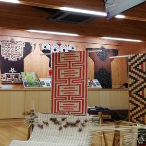左手前が一般的な生活に使われる織物です。 囲炉裏のまわりや入り口、窓の下、いろいろなところに使われる織物です。ガマのせんいはちょっと厚いので、フワフワしたクッション性もあって、座り心地は最高でした。
