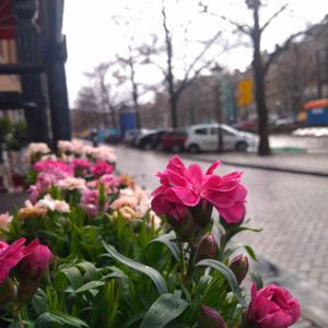 カーネーション越しのアムステルダム ここ数日少し荒れ模様で木曜日のストームに引き続き昨日今日と雹が降りました。小さなカフェの店先にあった矮性カーネーションです😊