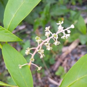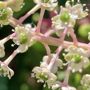 ヨウシュヤマゴボウの花です 北米原産の帰化植物ですが 人の手で植えられたものなのか お洒落なフレンチレストランへの取り付け道路の入口にあるサインを取り囲むように咲いていました 傍らの大きく繁茂した親草には 既に黒紫色に熟した実が赤紫色の房軸に鈴生りでしたが その毒々しい見た目どおり 実は有毒で食べられないそうです 花びらはなく 見えるのは5枚の萼片とのことです