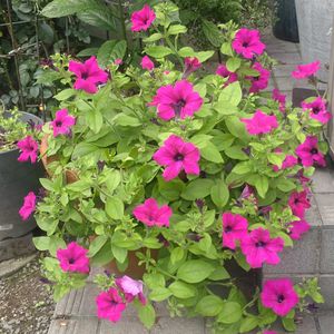 サフィニア PREMIUM SERIES パープル 切り戻して3週間です。花径8~9cm大輪で花付きバッチリ🌼うちの子は暴れん坊です😁 11号平鉢 φ(..)2025.4.13花苗植え付け