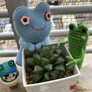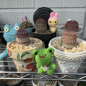 6日はカエルの日🐸 ムッチリぷくぷくの日🏷️参加しまーす😃 ①ムッチリ育った寄せ植えのプラグ苗の紫太陽たちを植え替えました♪ makimayさんにいただいた編み編み🐸&🐥とさくら餅子さんのリメ鉢🙏💕 ②ムチぷくのグロボーサちゃん、大きな鉢に植え替えました♪ ③今日咲いているサボたち ④カエルに見えない?🐸 ⑤きゅうちゃんさんのグロリオサ咲きました💕