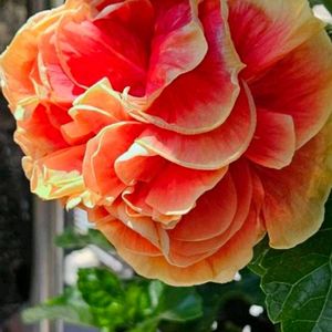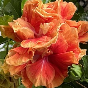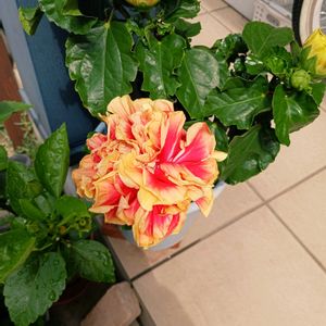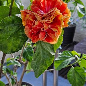 ハイビスカスビーチボール 一昨年の6月16日(土)にお迎えしました 前回の投稿が去年の9月30日(土) 八重咲きのハイビスカスビーチボール 蕾から開花までめちゃくちゃ時間がかかります😵💦 蕾は黄色でお花はオレンジ🍊色なんですよ😃 オレンジ🍊色になったのは今朝のことです🤗 去年から育てている我が家のハイビスカス🌺 6鉢全て冬越しました😃🎵