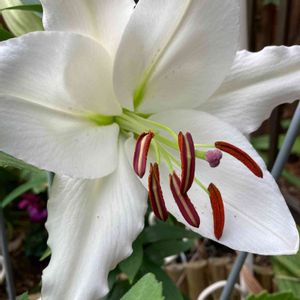 カサブランカ咲きました❣️😆 浅い植え付けのせいか、低い位置で蕾が膨らんでました。💦 もっとちゃんとしておけば良かった😰 花はきちんと咲いてくれてる〜💕