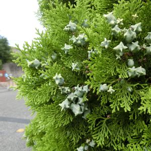 公園のコノテガシワ(コノテヒバ)の木に何とも不思議なものが…!何これ? よくよく見ると、薄緑色で金平糖のような可愛い形をした実です。 葉っぱが子供が手のひらを垂直に立てたような形をしていることがその名前の由来です。 朝鮮・中国北部原産。 ヒノキ科コノテガシワ属の常緑針葉高木。