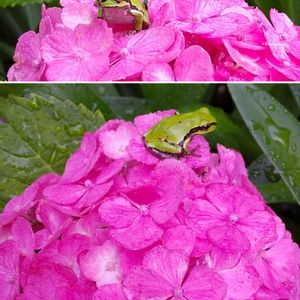 こんにちは✨🐸ケロ♪ 今朝の公園…ちびガエルくんに会いました💚 鮮やかなピンク色のアジサイのてっぺんで目立ってる! お手々をよく見ると… ピースサインしてますよ🤭 素敵な一日を~💕