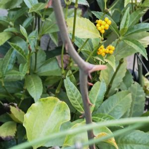 こんにちは! 山帰来のトゲの陰で黄色千両がみえます。