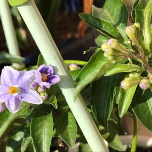 ツルハナナスのパープル咲きました。ホワイトと一緒に植えて行灯仕立てにしてます。 ヤマホロシで流通したものを買いましたが、これらは日本原産のヤマホロシではなくツルハナナスらしいです。