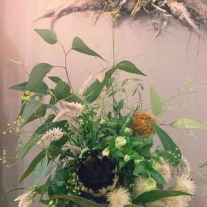 7月のレッスンは、ドライオブジェでした✨いっつもドライは11月だけなのに、、 意外でした〜 初めての横型ドライは、土台が難しく手伝ってもらいましたが時間が足りなくなって、家の花材で勝手に手直ししました。💦 パンパスグラスが可愛いです♡