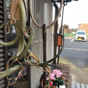 今日のお花はチランジアということで、わたしのキッチンのチラ類コーナー。 使わなくなったペーパーホルダーがとてもお役立ち🤘✨ 百均やHCやディスプレイされ過ぎてミイラ化寸前のものを連れ帰ったのが主で、珍しい種類はないです😊 そういうのが息を吹き返す感じがスキ(変態あるある) チラさんは忙しいとシリンジも忘れがちなので、忘れないためにもキッチンにいるのです。 なかでも宇宙人ブルボーサちゃんは可愛がっているのでよくお水にドボンされています🤢💦 もう一つ子株を吹きそうな雰囲気🎶