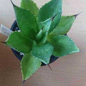 アガベ記録写真 2018/9/2撮影 ウチのアガベ番号120番 「チアペンシス」さん♪ 長く探し求めていた子と出会えました! \(^-^)/ まだ普及していないマイナーな子ですが、 出回り出したらきっと人気品種になると思っている品種♪ ある程度アガベを知っている人は、 この写真を見るだけで分かると思いますが、 特徴は…、 鮮やかな緑の葉 吉祥天みたいに赤い先刺 吉祥天みたいな葉先の絞れ方 そう全体のフォルムも、 吉祥天そっくりに! 即ち、 吉祥天を1回り小さくして、 葉色を明るい緑にした様な品種です♪ 個人的にはかなり理想♪(*^.^*) まぁ吉祥天の良さは、 あの美しい白肌で、 妖艶な美熟女の様な艶やかさが、 魅力なのですが、 この子はその流れをくみつつ、 明るく健康的で若々しい印象で、 うん、素敵♪(* ´ ▽ ` *)