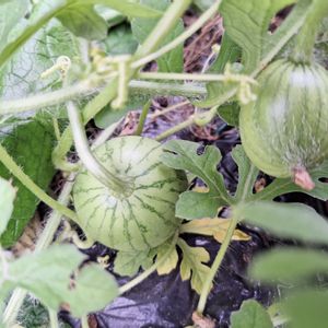 小玉スイカ ピノガール だんだん大きくなってきたよー♥️ 左側の実がテニスボールくらいです😊 お盆前には食べられるかな😋