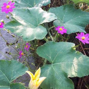 去年食べたかぼちゃの種。蒔いた訳ではないけれど芽が出て咲いてくれました。ひょっとして収穫できる?😁