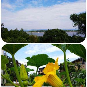 朝の雨も上がり ラッキー散歩に出かけました🎶 湖&空 垣根の上まで伸びて咲いたカボチャ🎃の花