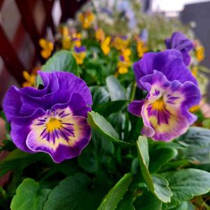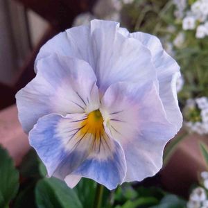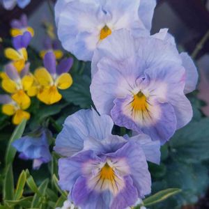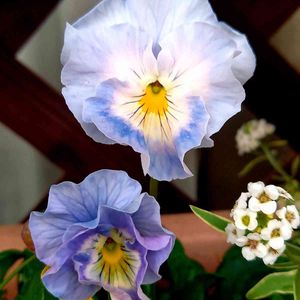 こんばんは~✨ 夕方のベランダから…淡いブルーの色あいのシエルブリエ💙💜と小さなビオラ、ミミ・ラパン🌼 挿し芽からのスーパーアリッサムも成長中🍀🍀