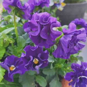 こんにちは~🎶 初めてのビオラ、神戸ビオラバニーブルー💜 🐰の耳みたいな花弁と色合いもお気に入りです、可愛いでしょ🥰 ミルフルと寄せ植えしてます🎵