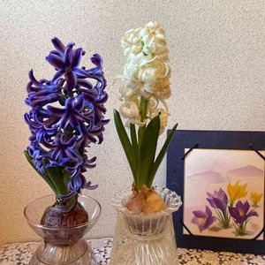 ヒヤシンスのパープルのお花が満開になりました💜真っ白な2輪目で、頑張って咲いています🤍嬉しいです( ◠‿◠ )V 我が家のクロッカスは、この寒さで、咲くのが止まってしまいました😆 北陸、東北、北海道などの地域、今回の大雪で、大変な状況です✨ホワイトアウト、吹き溜まりなど、くれぐれもご注意されて、お過ごし下さい! お見舞い申し上げます🙇🏼♀️ 紫色ー(ブルージャケット) 真っ白ー(ホワイトパール) ちぎり絵