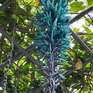 目の覚めるようなブルーグリーンお花です💙💚💙 この翡翠色が美しいですよねー🎶❣️ フジのお花を大きくしたようなお花、大きなもので60センチくらいになります💙 高いところに咲いているので、見つめていると、あっ、首が😆 今年はツボミも見る事ができました✨💖 左に細いロープのようなものが硬いツボミです✨初めてみました😆👌 ヒスイカズラ マメ科のつる性植物 フィリピンのルソン島が自生地だそうです💙 神代植物公園にて2022 3月末