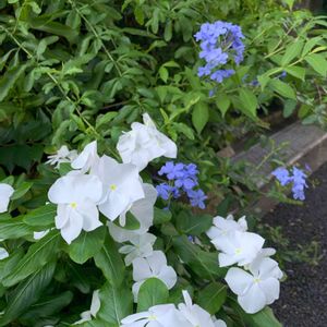 今日から8月、葉月 です! 我が家の夏の定番のお花 真っ白なニチニチ草とルリマツリのツーショットです💙🤍💙