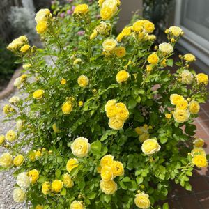 こんにちは~⛅️ 房咲きのイエローさん ゴールデンボーダー🌹 ブーケのように咲くのも 可愛いポイントです💛 今日は雨の予報が薄曇り⛅️ 暑くなり、早くもマメコガネを 発見👀 これから虫との闘いが…😅