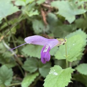 秋桐(アキギリ) シソ科アキギリ属の多年草。山地の木陰に生える。茎は下部が地面を這い、上部は立ち上がって高さ20~50㎝になる。葉は対生し、長柄があって葉身は三角状ほこ形で鋸歯があり長さ6~10㎝。花期は8~10月。枝先に紫色の唇形花が集まってつく。上唇はやや直立し、下唇は垂れ下がる。雌しべは長く花外へ突き出し、先端は2つに分枝している。雄しべは花内にあって見えない。花冠の内面に毛があり、ざらつく。萼は2唇形で毛がある。茎や花序に腺毛がない。 樹木の桐(キリ)の花に色と形が似ていて、秋に咲くことが名前の由来。 出典『山に咲く花』『野草の名前 秋』