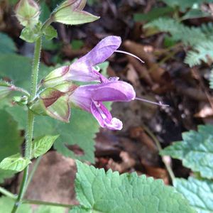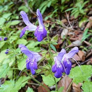 秋桐(アキギリ) シソ科アキギリ属の多年草。山地の木陰に生える。茎は下部が地面を這い、上部は立ち上がって高さ20~50㎝になる。葉は対生し、長柄があって葉身は三角状ほこ形で鋸歯があり長さ6~10㎝。花期は8~10月。枝先に紫色の唇形花が集まってつく。上唇はやや直立し、下唇は垂れ下がる。雌しべは長く花外へ突き出し、先端は2つに分枝している。雄しべは花内にあって見えない。花冠の内面に毛があり、ざらつく。萼は2唇形で毛がある。茎や花序に腺毛がない。 名前は、樹木の桐(キリ)の花に色と形が似ていて、秋に咲くことからついた。 出典『山に咲く花』『野草の名前 秋』