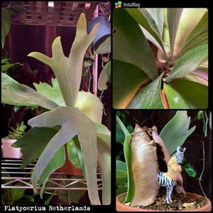 麋角羊歯のネザーランドさん…… 去年7月にお迎えし、ひとつは板付けもどきにし、これは鉢植えで管理。 途中、貯水葉兼胞子葉?みたいな葉っぱが出たりと楽しませてくれてるんだけど…… 今さらかもだけど、このコ…… 2株じゃないだろうか…… 貯水葉がいい感じにどこかの国のテントみたいになったから、シマウマタウロスの家にしてみた😁