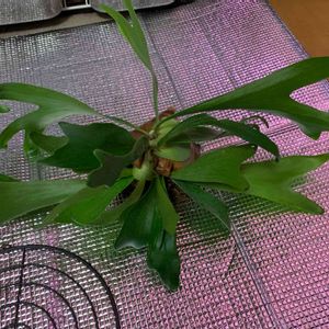 ビカクシダのネザーランドさん(板付けもどき)をぬるま湯に漬け、水切りのためお風呂場に吊るしていた…… タラと戯れてたら、お風呂場からぼてっと大きな音。 麻紐が劣化してたらしく、ネザーランドさんが水苔ごと落ちていた😓 幸い水苔を下に落ちたので葉っぱに損傷なし。 古い貯水葉をカットしてみたら、成長点が3つ😳 株分けしようか悩んだけど、とりあえずこのまま新しい水苔足して、また板付けもどきにしてやりました。
