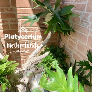 鹿角の先にビカクシダ ネザーランドさん……太め、硬めの葉っぱで元気アピール中🤗 ちょっと葉焼けさせちゃったのが残念ポイント😭