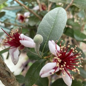 おはようございます⛅️☁️ 🌸フイジョア✨ フイジョアの花がやっと 咲いてきました✨ 可愛いお花です💓✨ 花びらも甘く美味しい😋 👍✨ 花に香りは無いようですが 🐽✨💖