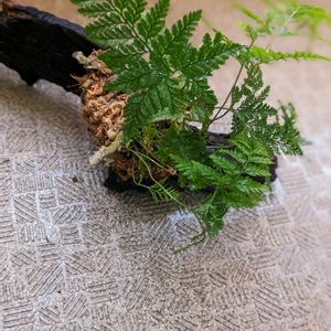 トキワシノブを買ってきて流木に活着させてみた。ドリルで穴開けて壁掛けにするかそのまま置型にするか悩みどころ