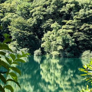 岐阜県へ向かう途中の九頭竜湖 深緑の木々が水面に映って綺麗でした🌲 無風ならもっと綺麗なんですけど 少し風が吹いて水面が揺れてました😅