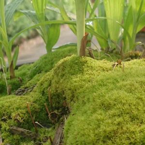 わたしはだ〜れ? ここはどこ? ムーミン谷?それとも腐海の奥? 私の土佐寒蘭の鉢際の異世界です。🤗🎵 蘭鉢が川の流れ後ろには百合の花ように伸び上がるスギゴケ 小さな雑草の芽はツワブキにも見え 右に少し見えている寒蘭がなければそこらの谷川に見えますね。🤗💕💕 たぶんシッポゴケかな? 分かる方教えてください。🙇⤵️