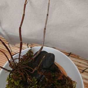 苔仲間10 友人からもらって石に苔といっしょに付けています。🤗🎵➰🎵 葉のないバルブの先につぼみのようなものが二つついています。🤗🎵➰🎵芽かもしれませんが。🤔