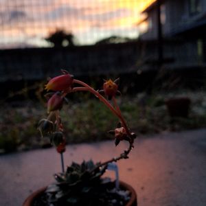 昨日の水やり。 夕焼けがキレイでした。 ヤマトヒメちゃん。 ♪( ´Θ`)ノう〜の口から 変化無し。。 だんだん色あせてきてるけど、咲かないのかな😓