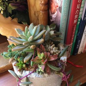 こんにちは😊🎶 先日の青空フェスティバルで見つけた多肉の寄せ植えです💕 メインはこのコンクリートを割ったぽい花器を作っているそうです😃 8種類の多肉さん達が入っていますが、名前はさっぱり分かりません😆💦 どの子でもいいので教えて下さい😌